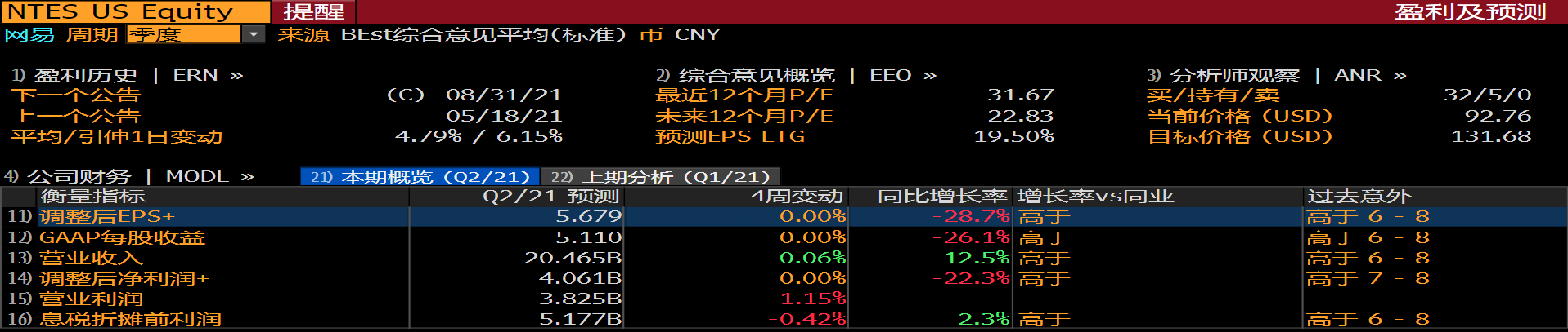 根据彭博一致预期,网易2021年第二季度营收预计为204.65亿元;调整后净利润为40.61亿元,调整后EPS为5.679元。37位分析师中有32位给出买入评级,5位给出持有评级。平均目标价131.68美元,较昨日89.62美元的收盘价有约47%的潜在上涨空间。