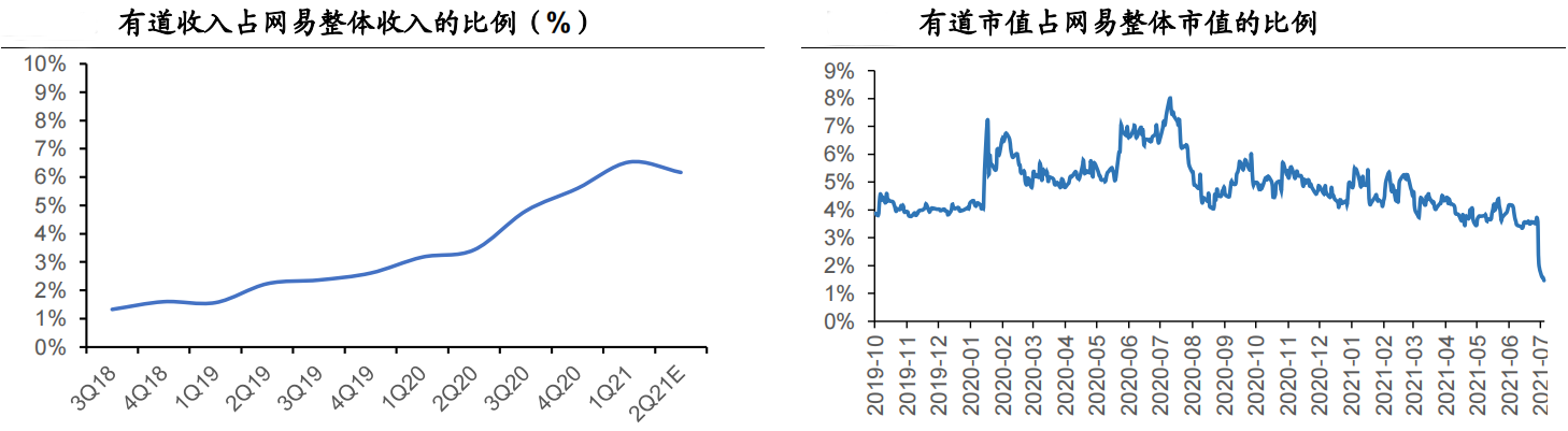 预期网易二季度在线教育业务营收13亿元左右,同比增速在100%以上,环比则略降。但由于教培行业受到严格的政策规管,未来有道旗下的K-12精品课业务将备受影响。有幸的是,鉴于有道的业务较为多元,旗下还拥有学习设备业务、广告业务以及成人和兴趣培训,或将对冲一定的行业政策风险,因此相比同业受到的影响更小。有分析师指出,有道上市以来,市值占网易整体市值的比例大致在4%~8%的范围内波动,有道市值下跌对网易整体估值的影响有限。