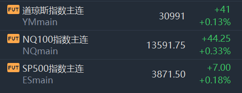 美国三大股指期货震荡走高,截至发稿,道指期货涨0.13%;纳斯达克100指数期货涨0.33%;标普500指数期货涨0.18%。