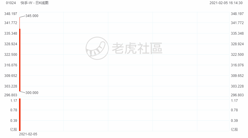 “短视频第一股”快手-W今日首日挂牌上市高开193.91%报338港元,盘中最高涨200%报345港元,全天收涨160.87%报300港元,成交375.47亿港元,位居港股第一,全天换手率3.59%。快手市值超1.23万亿港元,位居港股第9位,接近百度的2倍,超过京东,成为中国第五大互联网公司,仅次于腾讯、阿里、美团和拼多多。在A股所有上市公司中,快手市值也可以排到第8位。