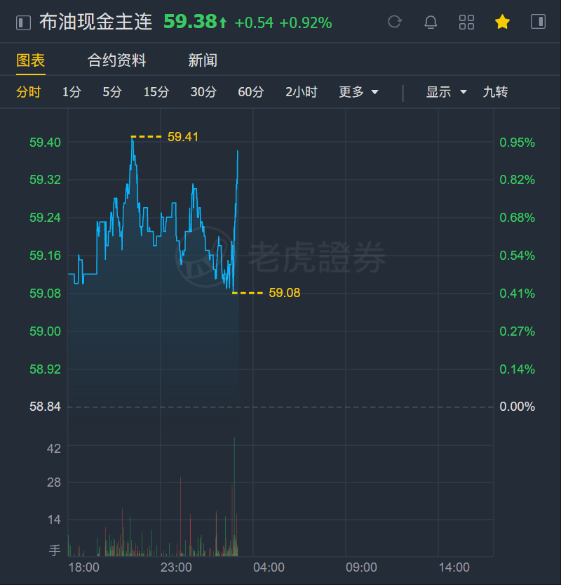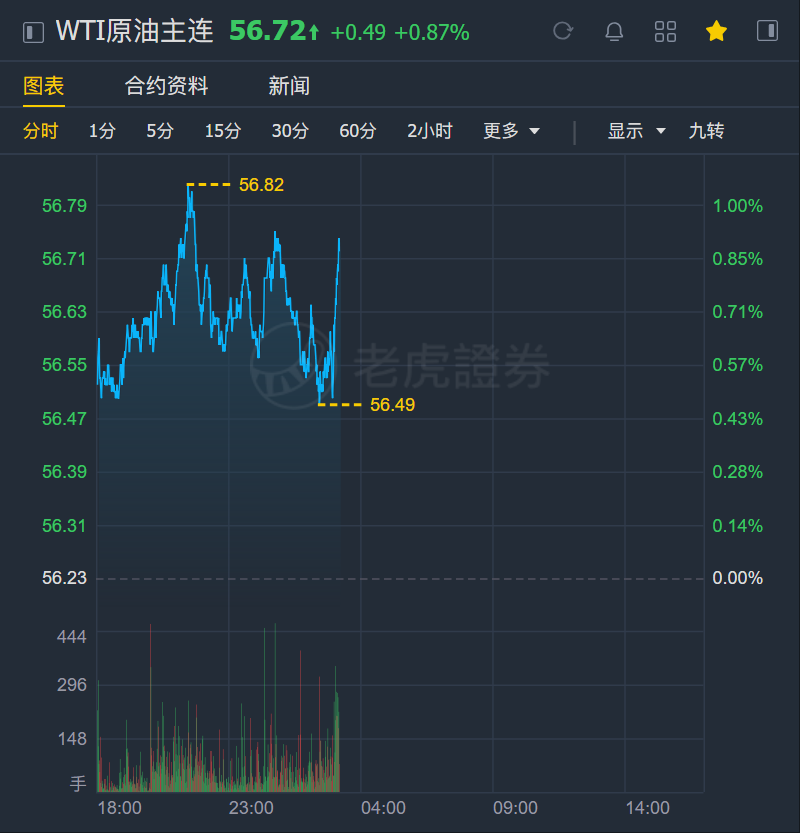 国际油价短线拉升,截止发稿,美油报56.72美元/桶,涨0.87%;布油现报59.38美元/桶,涨0.92%。