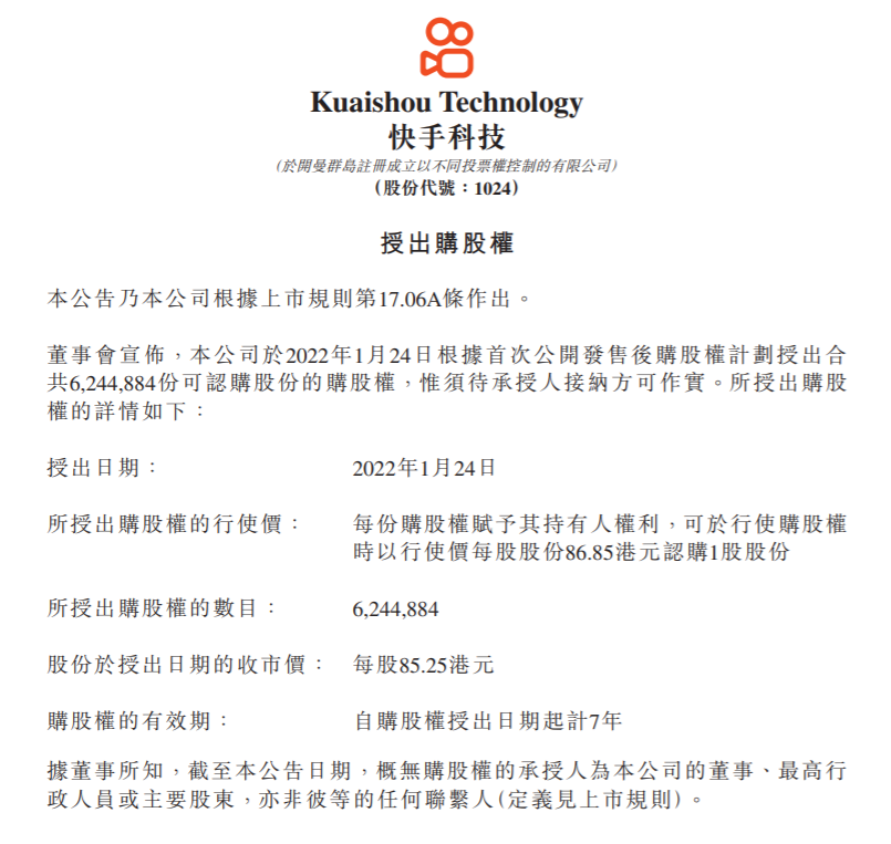 快手港交所公告,董事会宣布,本公司于2022年1月24日根据首次公开发售后购股权计划授出合共6,244,884份可认购股份的购股权,惟须待承授人接纳方可作实。每份购股权赋予其持有人权利,可于行使购股权时以行使价每股股份86.85港元认购1股股份。
