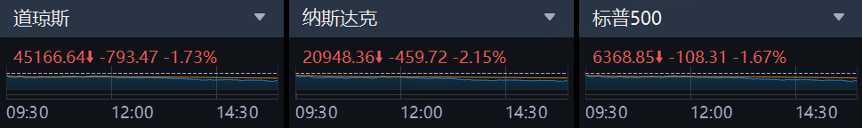 上周五,美股三大指数集体收跌,截至收盘,道琼斯工业平均指数跌1.73%,报45166.64点;纳斯达克综合指数跌2.15%,报20948.36点;标准普尔500指数跌1.67%,报6368.85点。