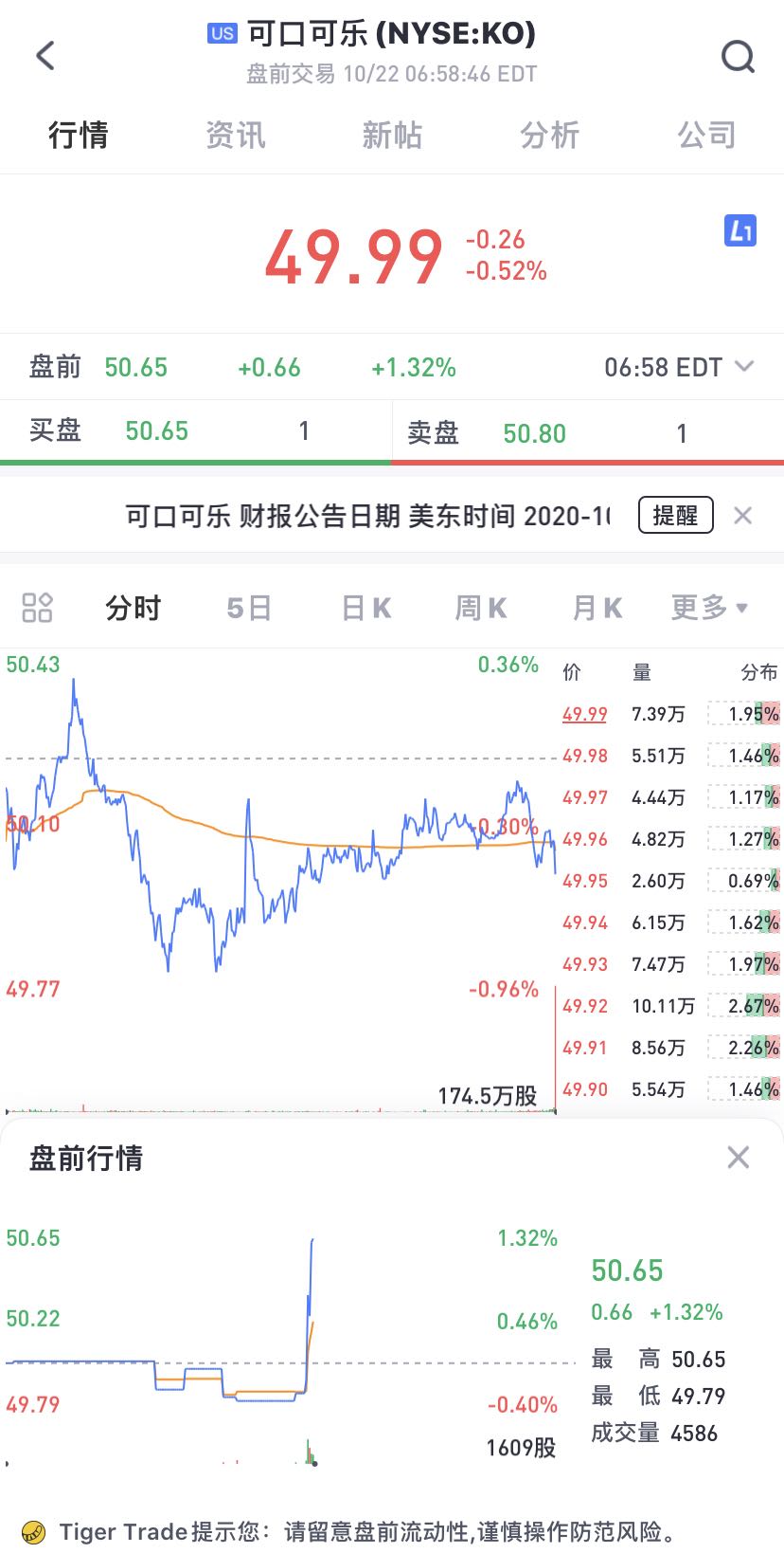 财报发布后,可口可乐涨1.32%,报50.65美元。