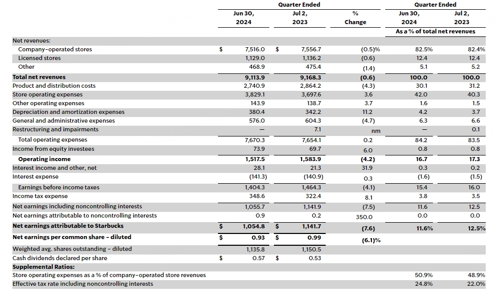7月31日,星巴克发布2024财年第三季度业绩。财报显示,第三季度净营收91.1亿美元,分析师预期92亿美元;第三季度调整后每股收益0.93美元,分析师预期0.92美元。