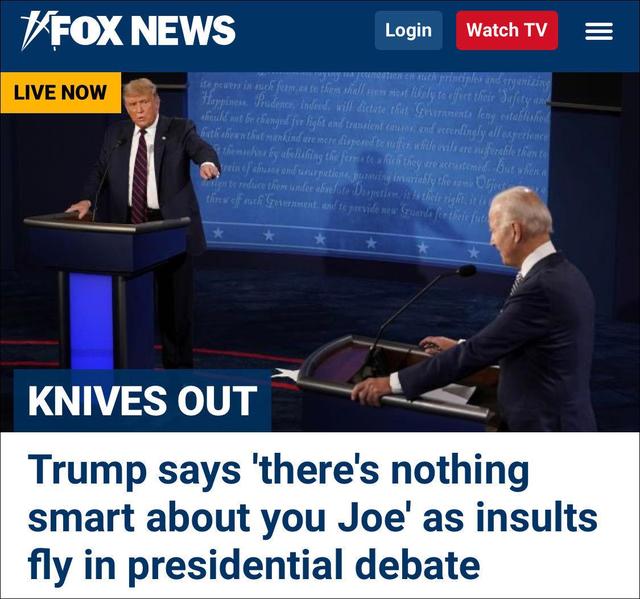 特朗普相对喜欢的福克斯新闻也看出来了,说“总统辩论中到处都是侮辱性言论”,比如特朗普说“你一点都不聪明,乔。”