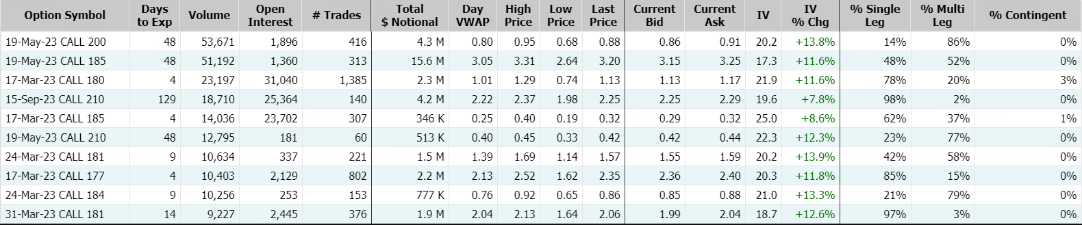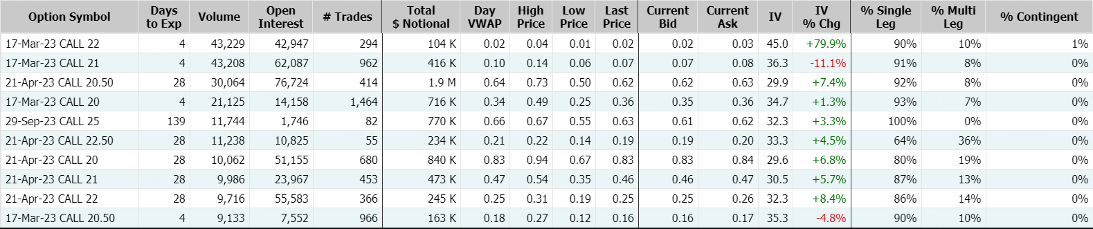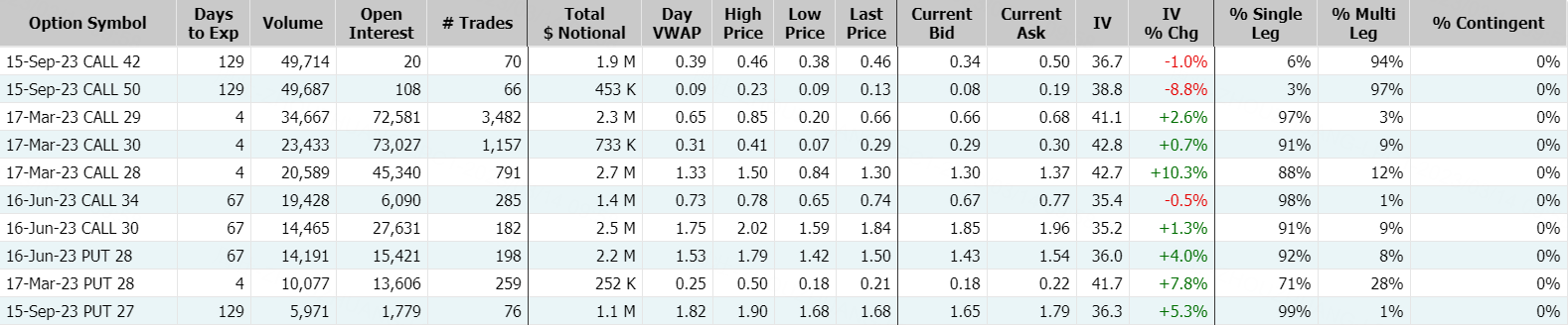 周一,期权市场总成交量4749.73万张合约,高于90日平均成交量;SVB危机持续发酵,银行股重挫,BAC、XLF、KRE期权成交仍保持高位;市场避险情绪升温,贵金属大涨,GLD、SLV、GDX期权成交量激增,其中Call成交占比约八成>>>