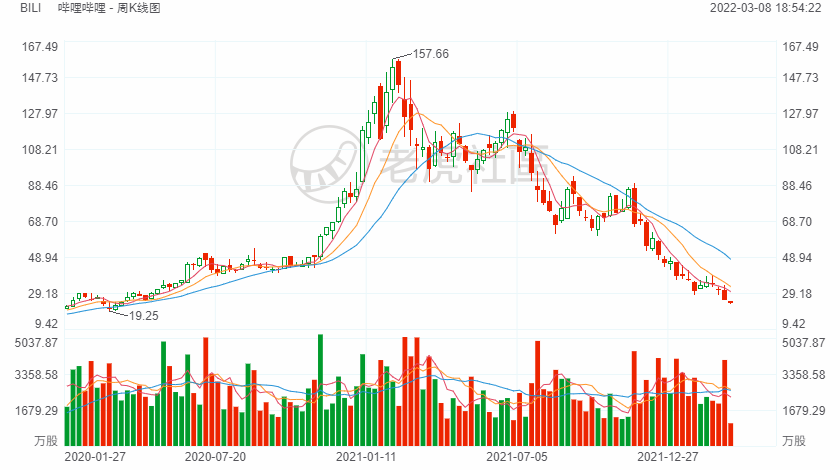 从投资角度来看,B站股票发行后,股价经历了四个阶段变化。底部的调整蓄力是第一阶段,上升是第二阶段,股价到157美元之后就回调了,再从底部冲到125美元,形成一个“双高峰”的曲线。