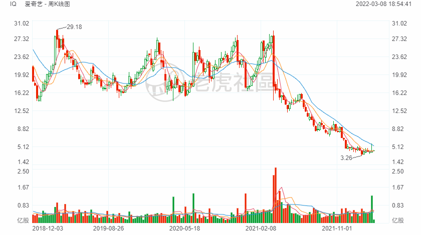 爱奇艺的股价图形则相反,它在高位调整以后并没有如愿开启阶段一,反而从顶部直接跌下来,一直下到4美元。这样的颓势主要还是因为公司一直亏损,但是参照海外Netflix(奈飞)的模式,爱奇艺仍有“起飞”可能。