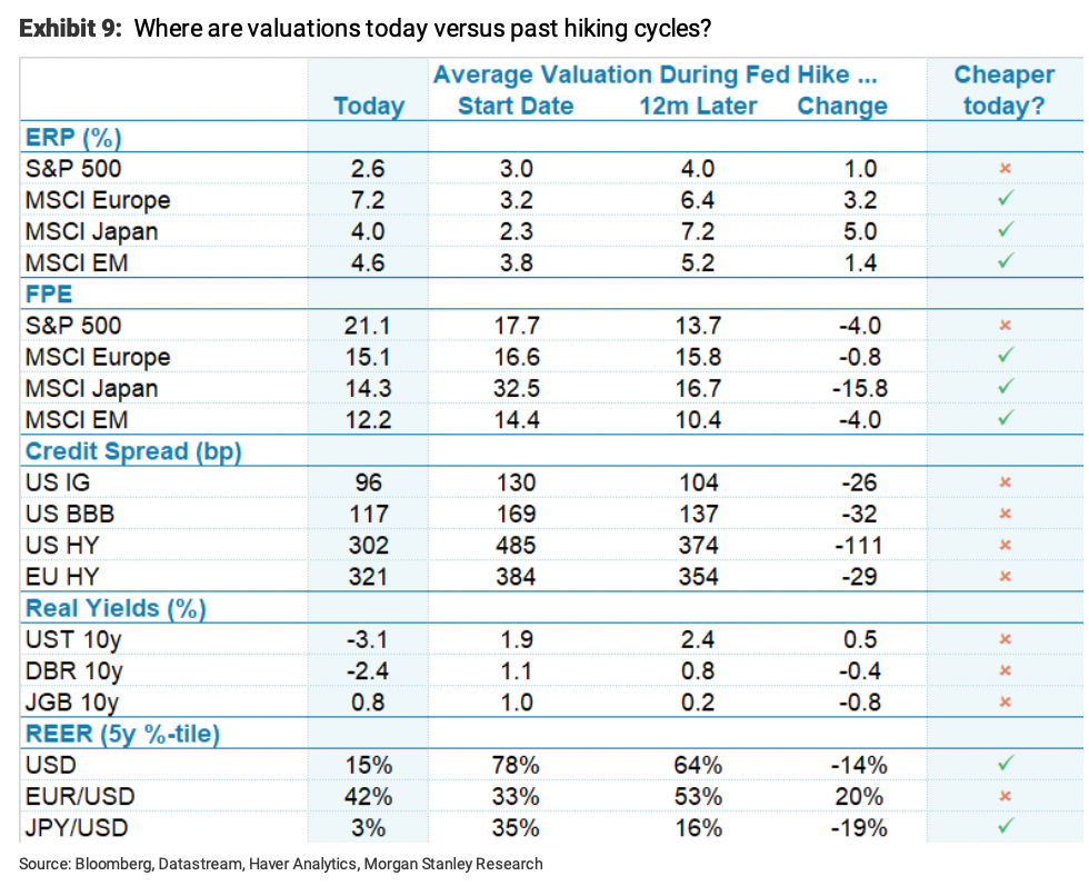 从初始估值来看,大摩发现现今比以往加息周期开始的估值要高得多,而美国除外。这是大摩偏好欧洲和日本股票而非美国股票的一个关键因素。