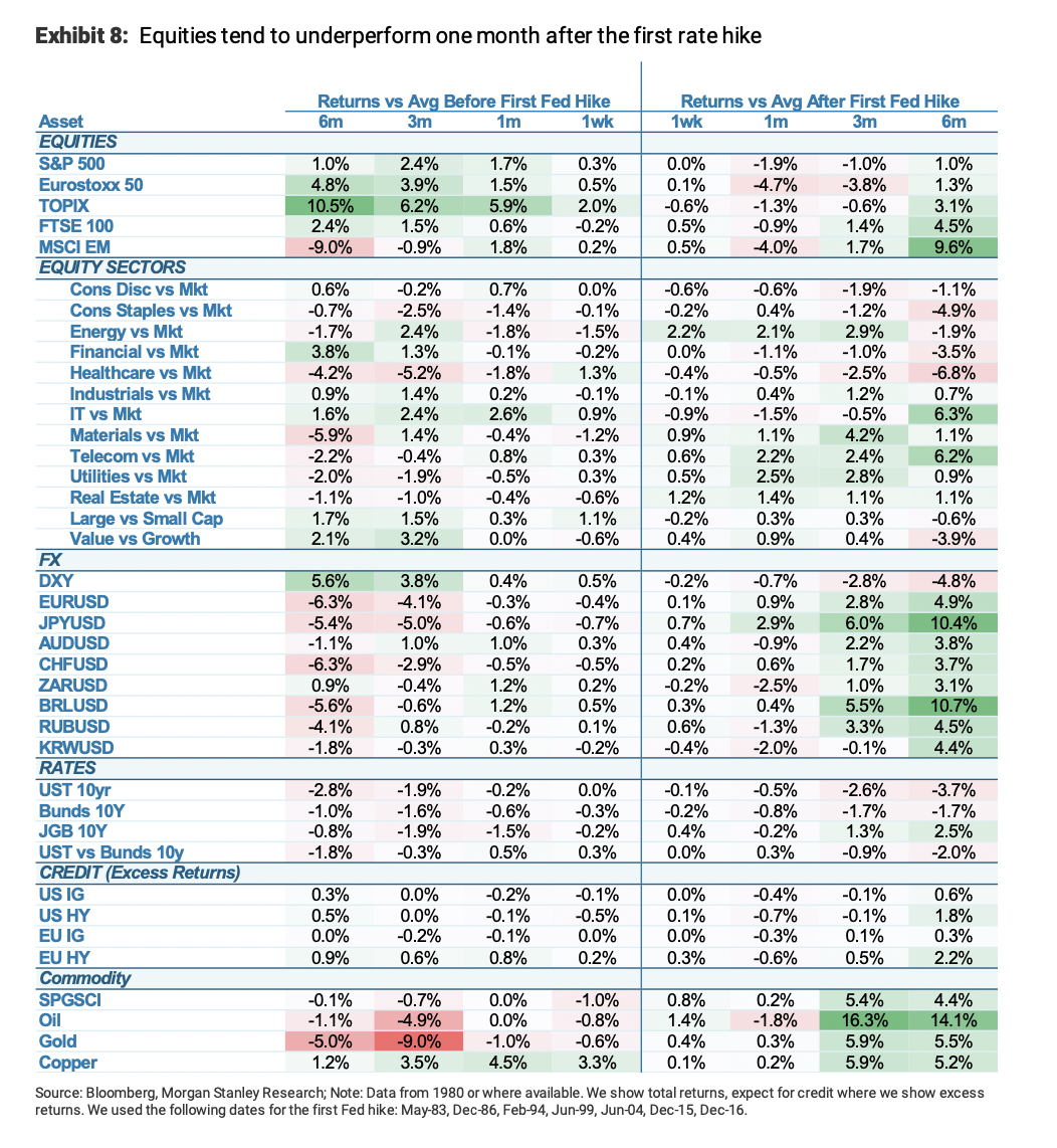 大摩回顾过去加息周期中的跨资产表现和估值,指出了以下五点: