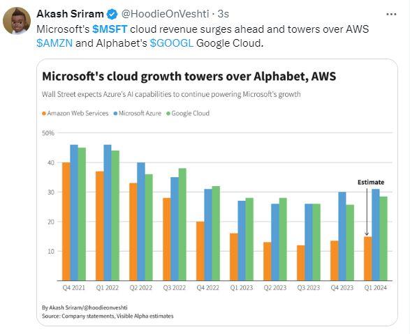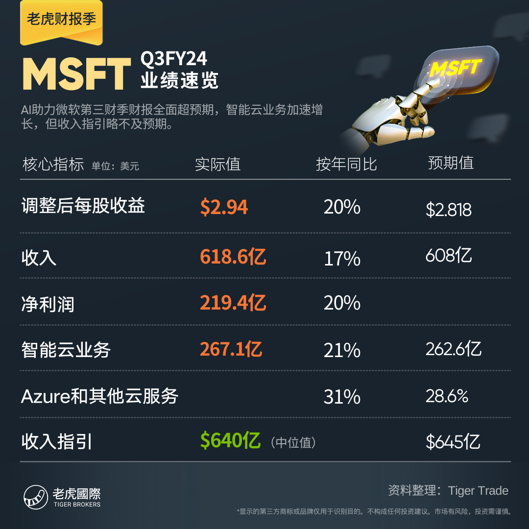 AI驱动的增长令微软当季财报关键指标和各项业务全面超预期,其中整体微软云收入同比增23%至351亿美元,智能云收入增21%至267亿美元,Azure收入逐季加速增长,令股价盘后涨超4%。