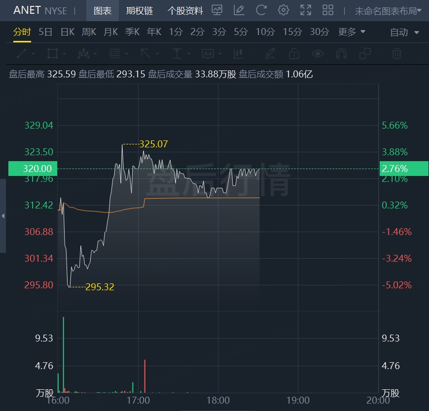 财报公布后,收跌近2.9%的Arista股价在美股盘后上演V形大反弹,先加速下跌,盘后一度跌超5%,后掉头上行,抹平盘后跌幅转涨,目前盘后涨近3%。