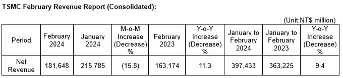 台积电2月净收入1816.5亿新台币,同比增长11.3%