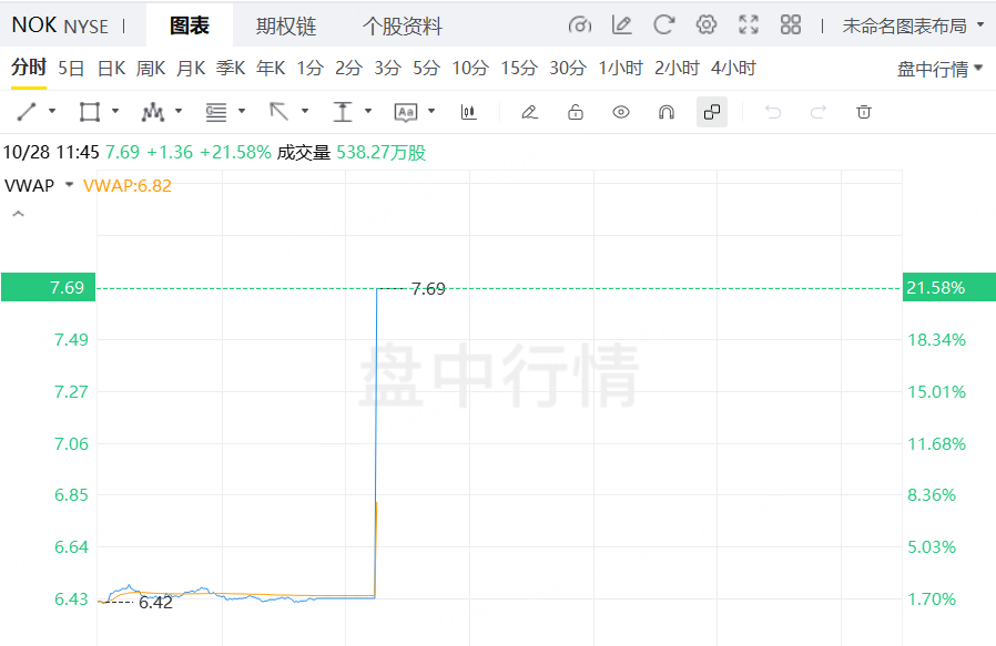 10月28日,据报道,英伟达将向诺基亚进行10亿美元股权投资,该笔交易将使英伟达持有诺基亚2.9%的股份。英伟达将利用自家芯片来加速诺基亚的5G和6G网络软件(开发),并探索在自家人工智能(AI)架构里利用英伟达的数据中心技术。诺基亚美国上市股票恢复交易,现涨超21%。