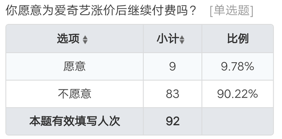 陆玖财经问卷调查了身边92个同事朋友,90%的人表示爱奇艺涨价后不再愿意付费,而且39%的人选择卸载掉爱奇艺转而去关注腾讯视频、B站或者其他视频软件。