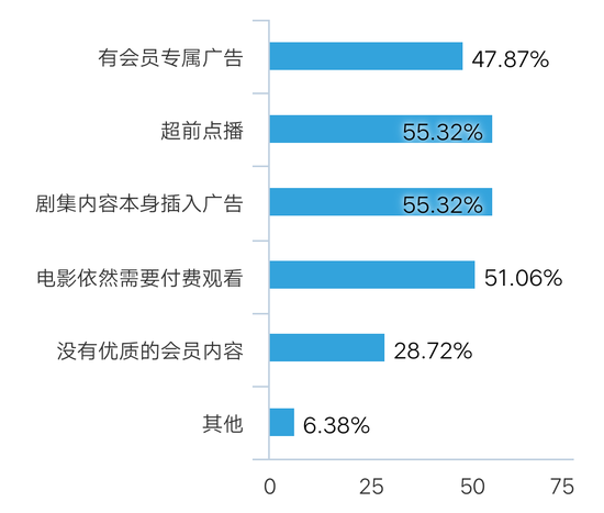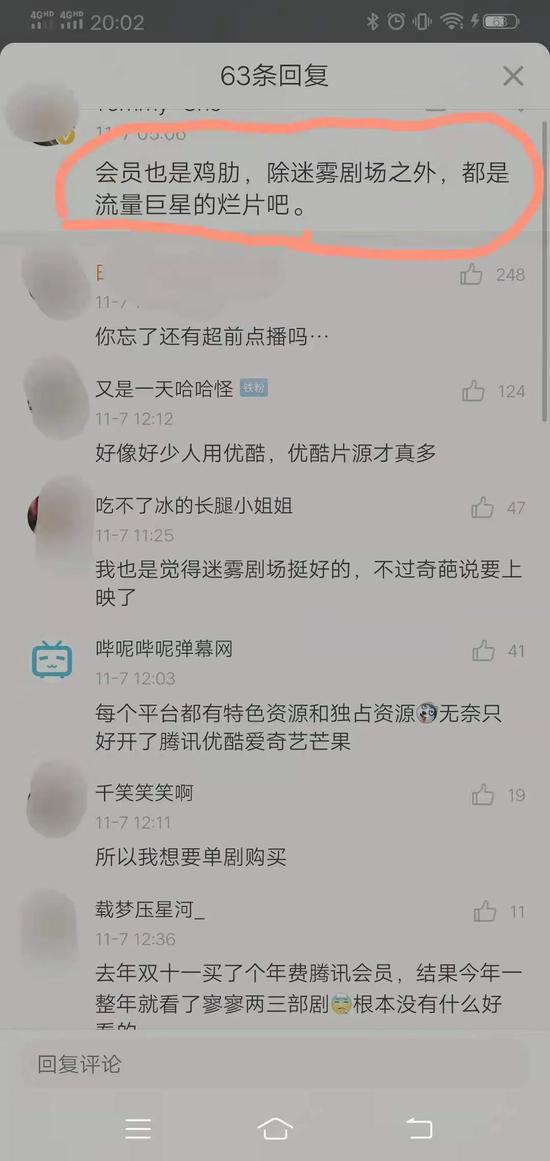 爱奇艺会员有会员专属广告,剧集内容本身也插入广告、VIP会员依然要付费看付费电影,没有丰富优质的会员内容。尤其是在2019年11月,《庆余年》在爱奇艺和腾讯视频首播,爱奇艺和腾讯携手花式作死的弄超前点播,被网友吐槽“套娃式撸会员”。
