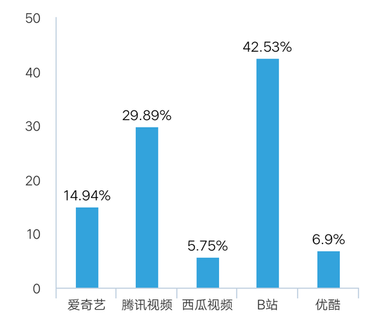 陆玖财经随机调查的92人中(以年轻用户为主),有42.53%的人表示最常用的中长视频软件是B站,29.89%的人最常用的中长视频软件是腾讯视频,只有14.94%的人最常用爱奇艺。