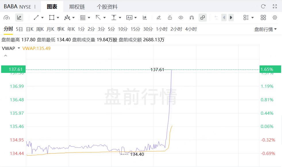 受此消息影响,阿里巴巴股价盘前拉升。