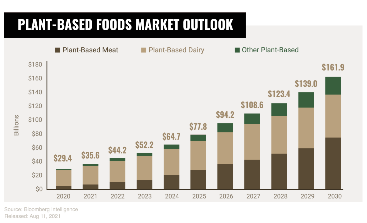 First and foremost, it is crucial to quantify the pace at which the opportunity in plant-based foods is progressing. Per Bloomberg Intelligence, the plant-based-foods market is expected toaccelerate to $162 billionin 2030 from $29.4 billion at present.