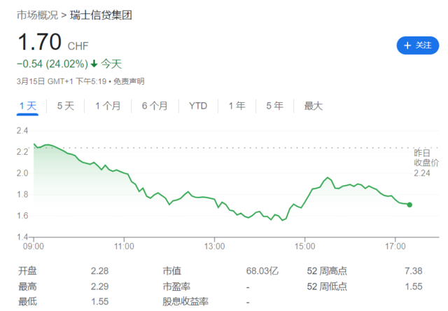 周三,瑞信集团股价盘中一度跌超25%,并创下历史新低1.55瑞士法郎,报收1.7瑞郎,跌幅达24%,创史上最大跌幅。这反映出市场担忧美国的地区银行危机已经蔓延到了大西洋对岸的欧洲。但在瑞士央行的声明公布后,瑞信ADR跌幅收窄,收跌13.95%,报2.1599美元,创1995年美国IPO以来收盘新低。