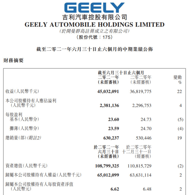 吉利汽车:在2021年上半年,本集团于中国市场的总销量同比增加13%至576,815部(包括本集团拥有50%权益之合营公司领克投资有限公司所销售的领克品牌汽车销量),同期中国市场乘用车总销量录得同比上升27.0%。