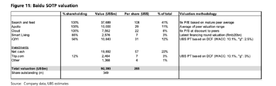 截至目前,金山云的股价为117亿美元,按照百度智能云在2021年的发展,估值范围还是会高于百亿美元规模。如果从百度的整体业务来估算其未来价值,可以参考去年12月瑞银发布的百度研报来进行分析。