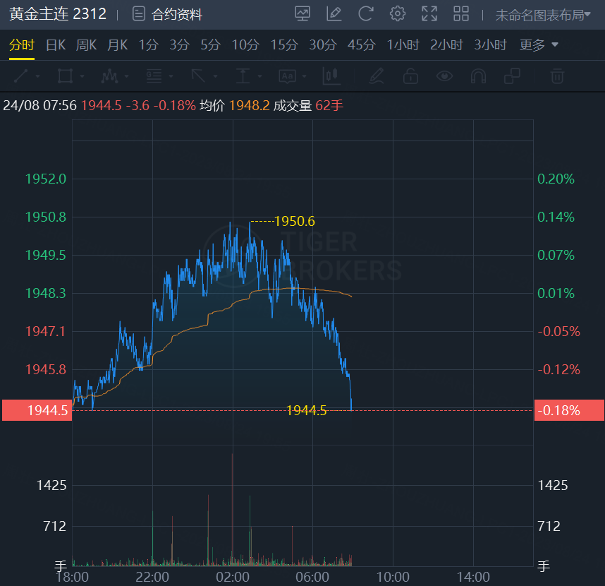 黄金期货小幅走低,截止发稿,跌0.18%,报1944.5美元/盎司。