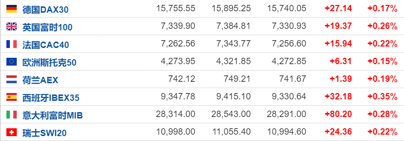 欧洲主要股指全线上涨,截至发稿,德国DAX30指数涨0.17%,英国富时100涨0.26%,法国CAC40涨0.22%。