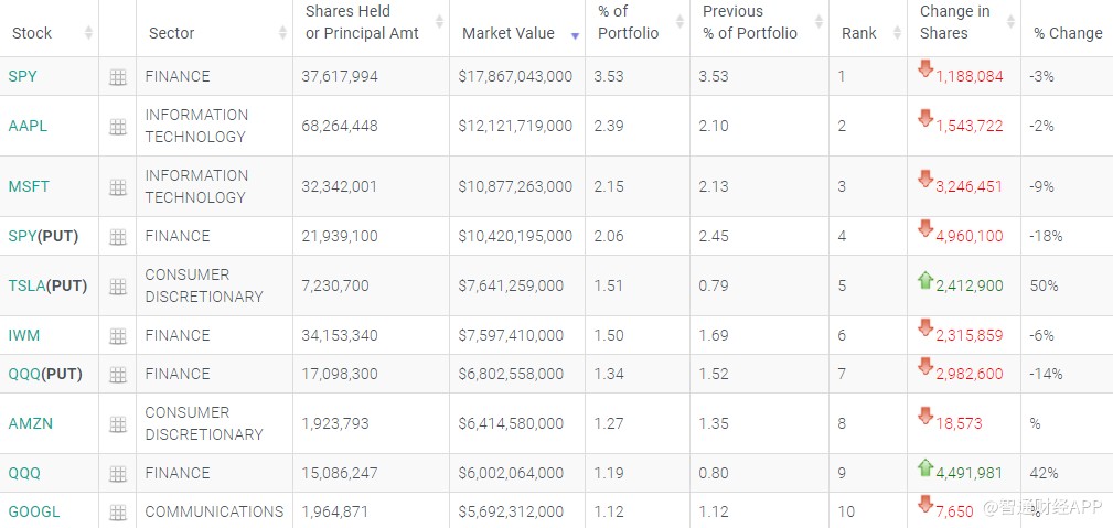标普500指数ETF看跌期权(SPY.US,PUT)、特斯拉看跌期权(TSLA.US,PUT)分别位列第四、第五,持仓市值分别为104.20亿美元、76.41亿美元,占投资组合比例分别为2.06%、1.51%。