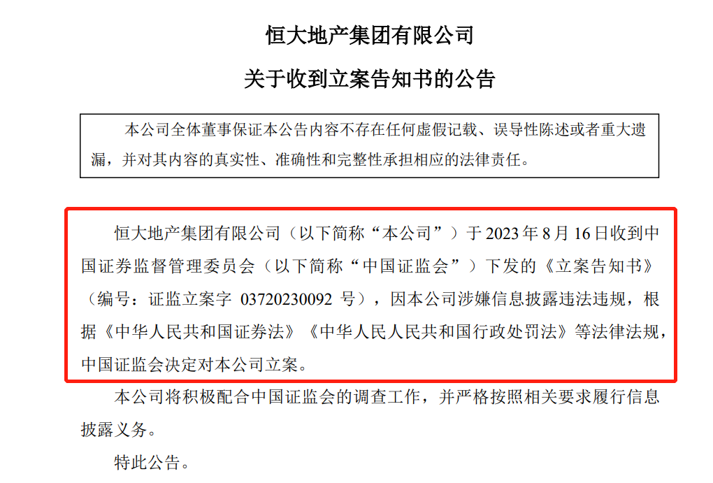今年8月16日,恒大地产于沪深交易所发布关于收到立案告知书的公告。公告显示,恒大地产收到中国证监会下发的《立案告知书》,因公司涉嫌信息披露违法违规,根据《中华人民共和国证券法》《中华人民共和国行政处罚法》等法律法规,中国证监会决定对恒大地产立案。