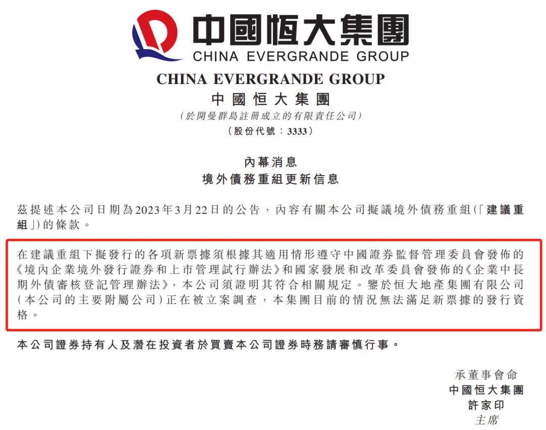 综合来看,即在恒大的境外债务重组中,有将发行新票据作为其中的一种债务安排,但是目前最新情况是,因为证监会对其地产板块子公司恒大地产立案调查,过不了监管的“关”,中国恒大满足不了新票据发行资格了。