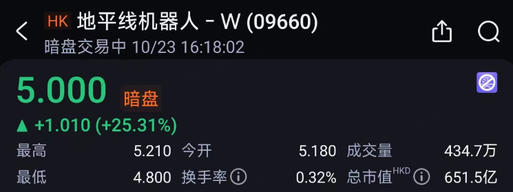 10月23日,自动驾驶运算服务商地平线机器人暗盘大涨超25%。公司以3.99港元的上限价格招股,每手600股,入场费2418.14港元,按目前涨幅,一手赚超600港元。