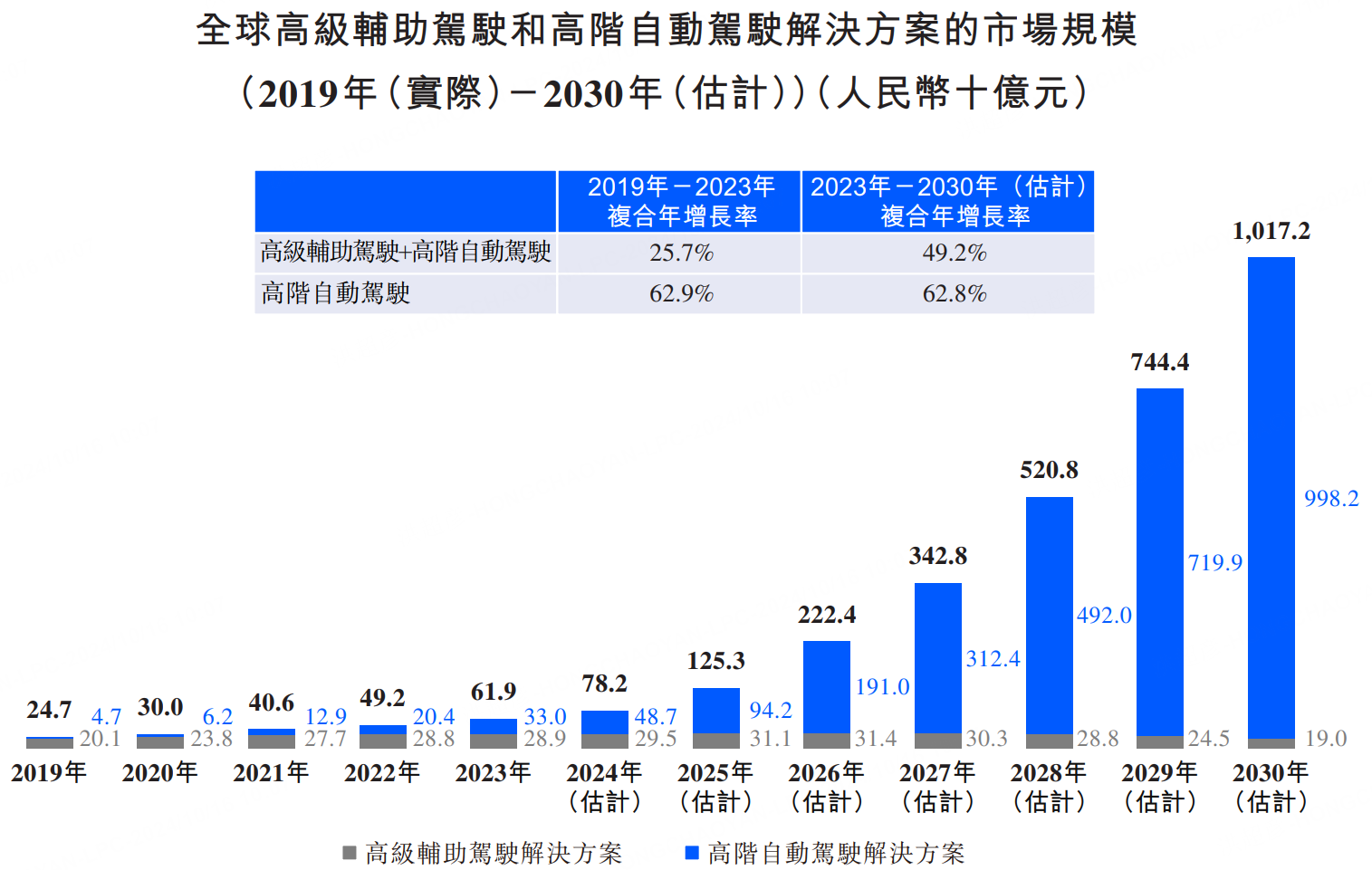 根据灼识咨询的资料,全球高级辅助驾驶和高阶自动驾驶解决方案市场规模在2023年已达619亿元,并预计将以49.2%的复合年增长率在2030年增长至10171亿元。