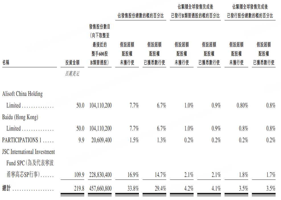 公司此次IPO吸引了境内外众多知名机构投资者的参与,阿里巴巴、百度和一家宁波市政府基金为基石投资者,认购总额达到约2.2亿美元(约17亿港元)。