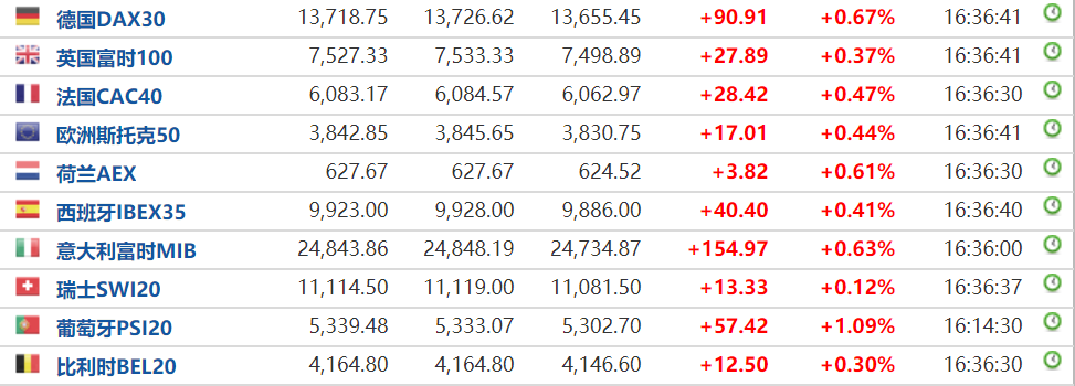 欧洲股市全线上涨,截至发稿,德国DAX30指数涨0.67%,英国富时100指数涨0.37%,欧洲斯托克50指数涨0.44%,法国CAC40指数涨0.47%。
