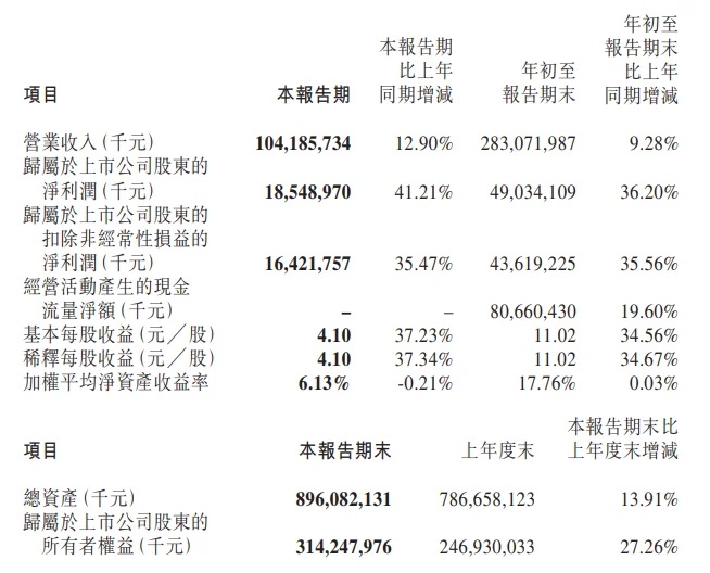 宁德时代 公告,公司第三季度营收1041.86亿元(人民币),同比增长12.9%;归属于上市公司股东的净利润为185.49亿元,同比增长41.21%;经营活动产生的现金流量净额为164.22亿元,同比增长35.47%。