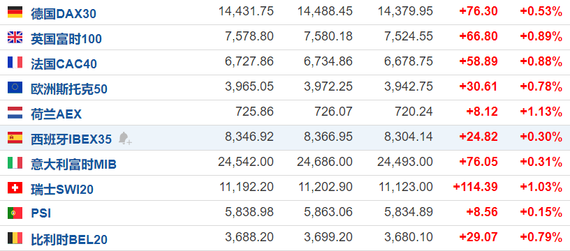 欧洲主要股指集体上涨,截至发稿,德国DAX30指数涨0.53%,法国CAC40涨0.88%。原油