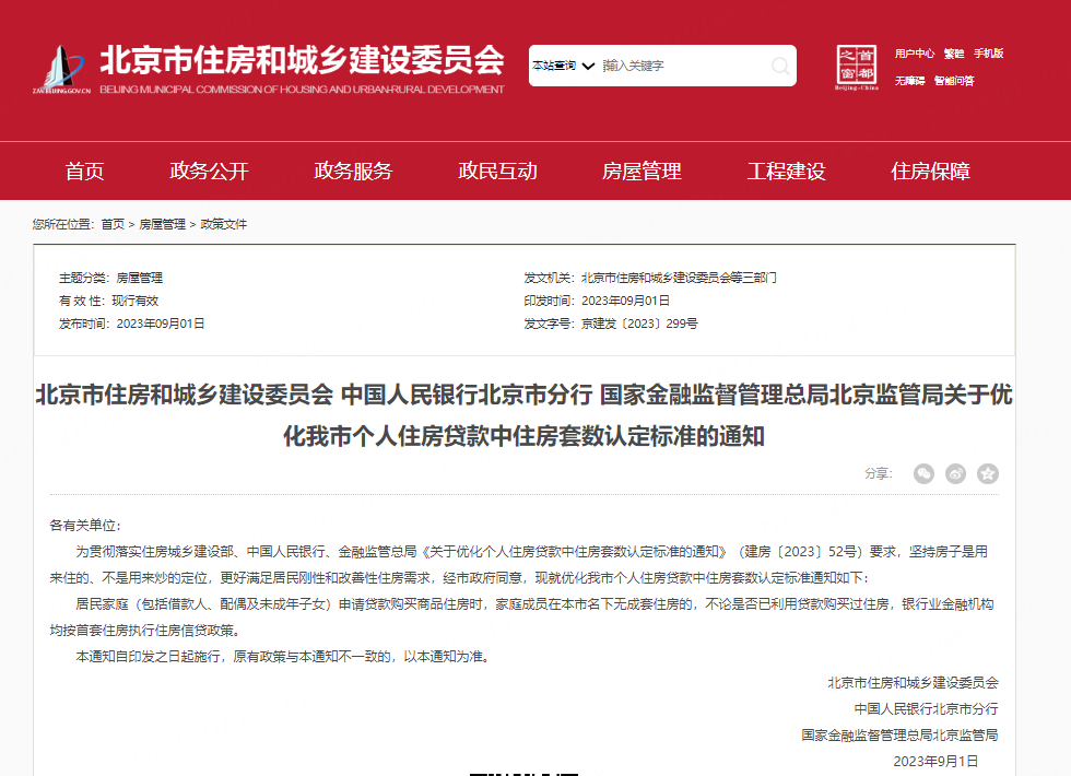 9月1日,北京市住房和城乡建设委员会、中国人民银行北京市分行、国家金融监督管理总局北京监管局发布关于优化北京市个人住房贷款中住房套数认定标准的通知。