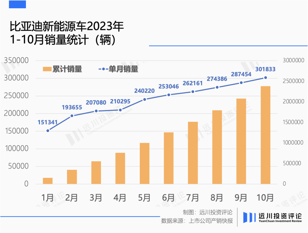 几个月前,比亚迪2023年上半年125万辆的销量刚刚让它成为历史上首个跻身全球前十大车企的中国企业,而随后7月(26.2万辆)、8月(27.4万辆)、9月(28.7万辆)、10月(30.1万辆)节节攀升的月度数据,更是让今年的累计销量已经飙升到了237万辆,距离芒格给出「今年将至少销售250万辆汽车」的预测,只差一步之遥。