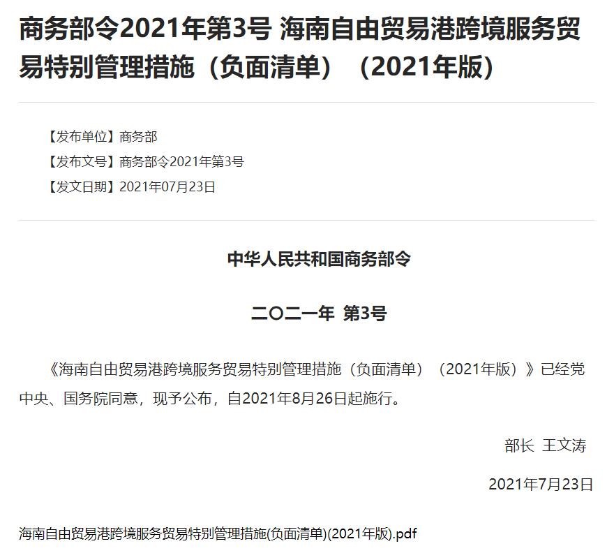 7月26日讯,商务部发布海南自由贸易港跨境服务贸易特别管理措施(负面清单)(2021年版),自2021年8月26日起施行。《海南自由贸易港跨境服务贸易特别管理措施(负面清单)(2021年版)》统一列出国民待遇、市场准入、当地存在、金融服务跨境贸易等方面对于境外服务提供者以跨境方式提供服务(通过跨境交付、境外消费、自然人移动模式)的特别管理措施,适用于海南自由贸易港,地域范围为海南岛全岛。未作特别说明的,仅适用于境外服务提供者向海南自由贸易港内的市场主体及个人提供服务。《海南自由贸易港跨境服务贸易特别管理措施(负面清单)(2021年版)》之外的领域,在海南自由贸易港内按照境内外服务及服务提供者待遇一致原则实施管理。【详细】