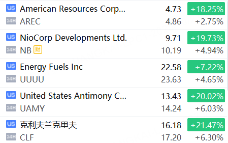 10月21日,美股夜盘时段,稀土概念股继续表现活跃,克利夫兰克里夫、United States Antimony Corp涨超6%,NioCorp Developments、Energy Fuels Inc涨超4%,American Resources Corp涨超2%。