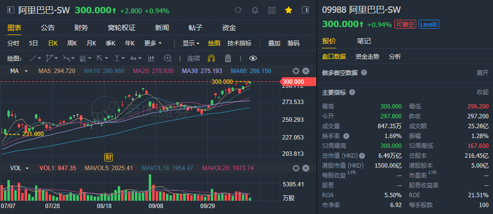 阿里港股首次突破300港元关口,市值逼近6.5万亿港元