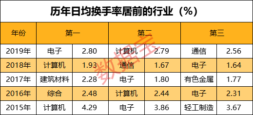 证券时报·数据宝统计显示,从各个行业的换手率来看,科技板块(电子、计算机、通信)的日均换手率霸榜了前三名;往前追溯,电子行业是近5年来较为受关注的对象,一直在行业日均换手率前三的位置上变动。