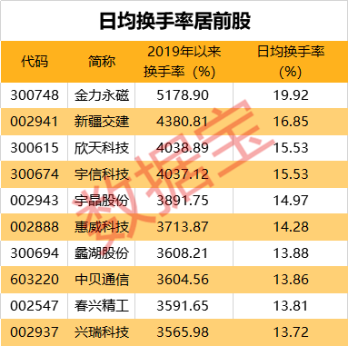 日均换手率居前的个股中,金力永磁、新疆交建、欣天科技、宇信科技的日均换手率在15%以上;宇晶股份、惠威科技、蠡湖股份、中贝通信等18股日均换手率均超12%,且这些个股的2019年以来的累计换手率均超3000%,也就是说近一年多的时间,筹码已经换了超30遍。