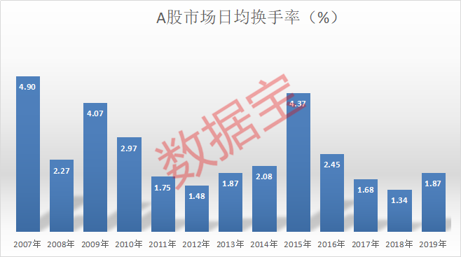 换手率高的股票一般表明资金进入量相对较多,属热门股;反之换手率低的股票资金进入量相对少,属冷门股。数据宝统计显示,从2019年以来的个股数据来看,剔除2019年以来上市的次新股后,仅403股的换手率高于5%,占所有个股的比例仅11%,其中有50股换手率在10%以上。