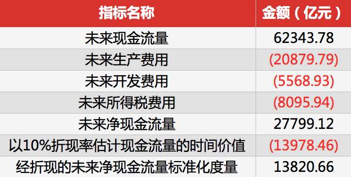 它是这样估值,将现有已探明储量的油气,按一定的生产曲线进行假设(油价依据为入库时的价格,生产成本按当时的情况测算),计算出未来净现金流,再将未来净现金流,以10%的折现率进行折现,得出最终结果。