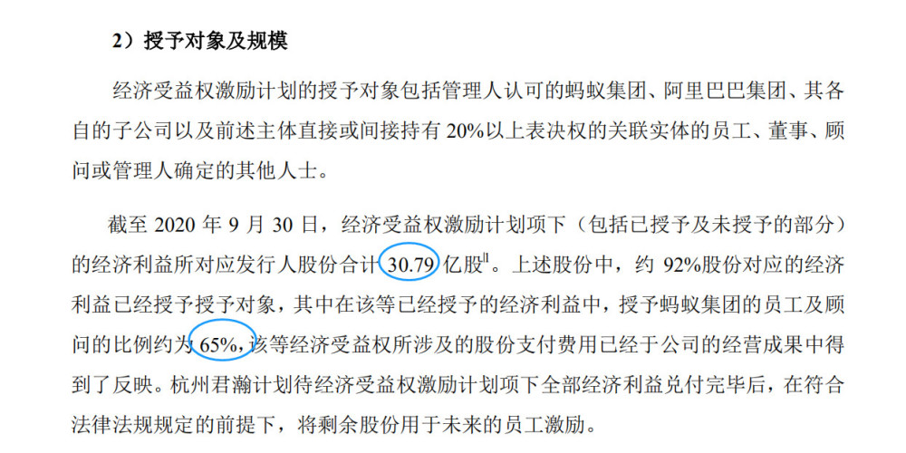 根据蚂蚁集团招股书信息显示,截至2020年9月30日,经济受益权激励计划项下的经济利益所对应发行人股份合计30.79亿股,其中授予蚂蚁集团的员工及顾问的比例约为65%。