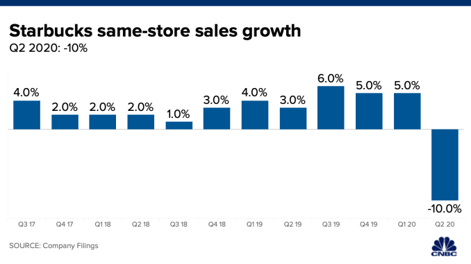 本月初,该公司以冠状病毒危机的“动态性质”为由,撤回了其2020财年的预测。星巴克周二表示,由于三月底在美国实行了社交疏散措施和家庭住所定单,该公司预计其第三季度财务报告将显示出该流行病的急剧下降。预计第四财季的负面财务影响将缓和。