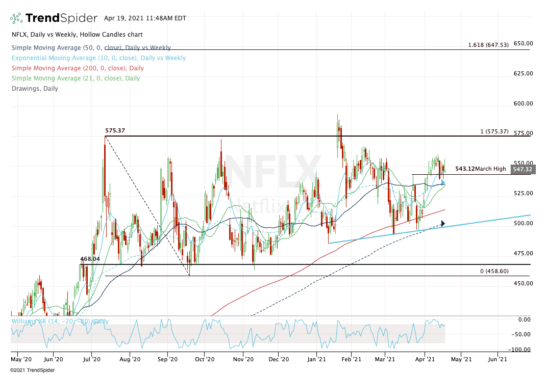 A few weeks ago, Netflix stock gapped above the March high at $543.12. While it’s failed to gain much momentum over this measure, it continues to hold above this mark.